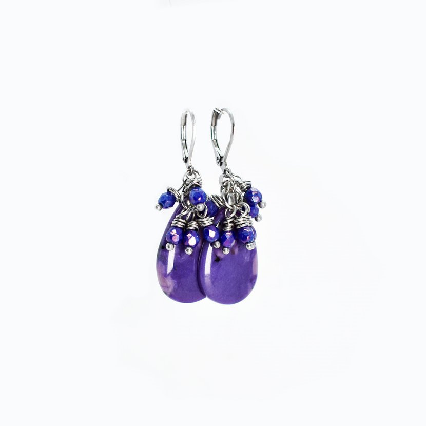 Luxusní Boho náušnice - kapky fialového kamene a hrozny z českých ohňovek.