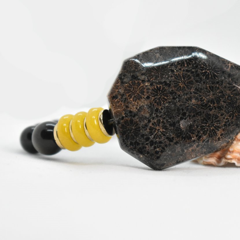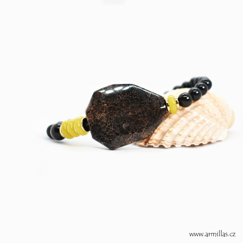 Velký achátizovaný korál a korálky onyxu a žlutého jadeitu. Velký prvek 3,5 x 2,5 cm