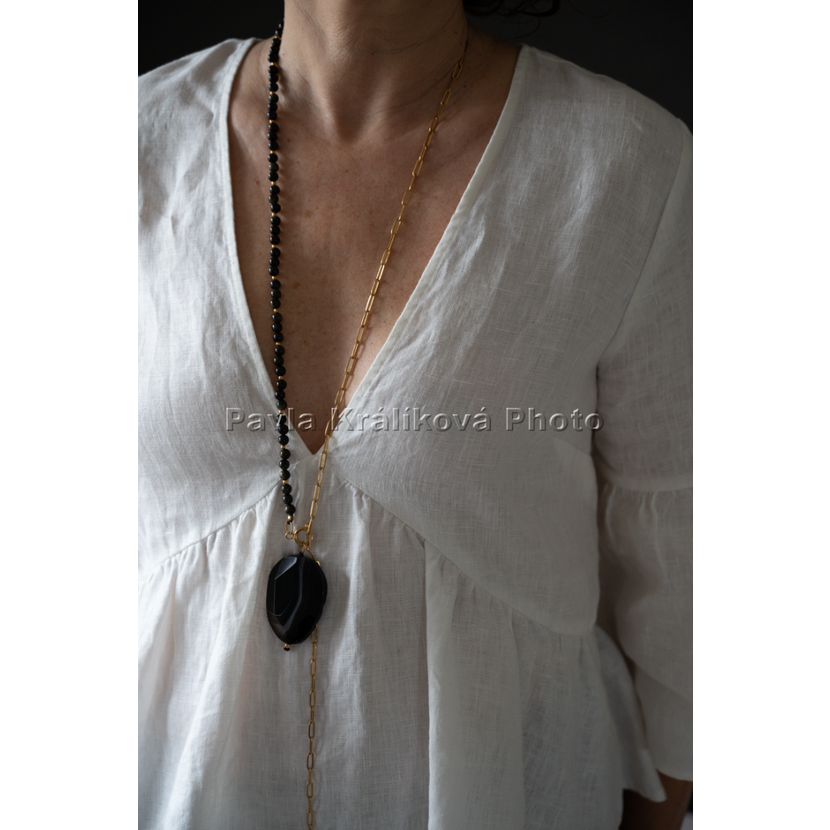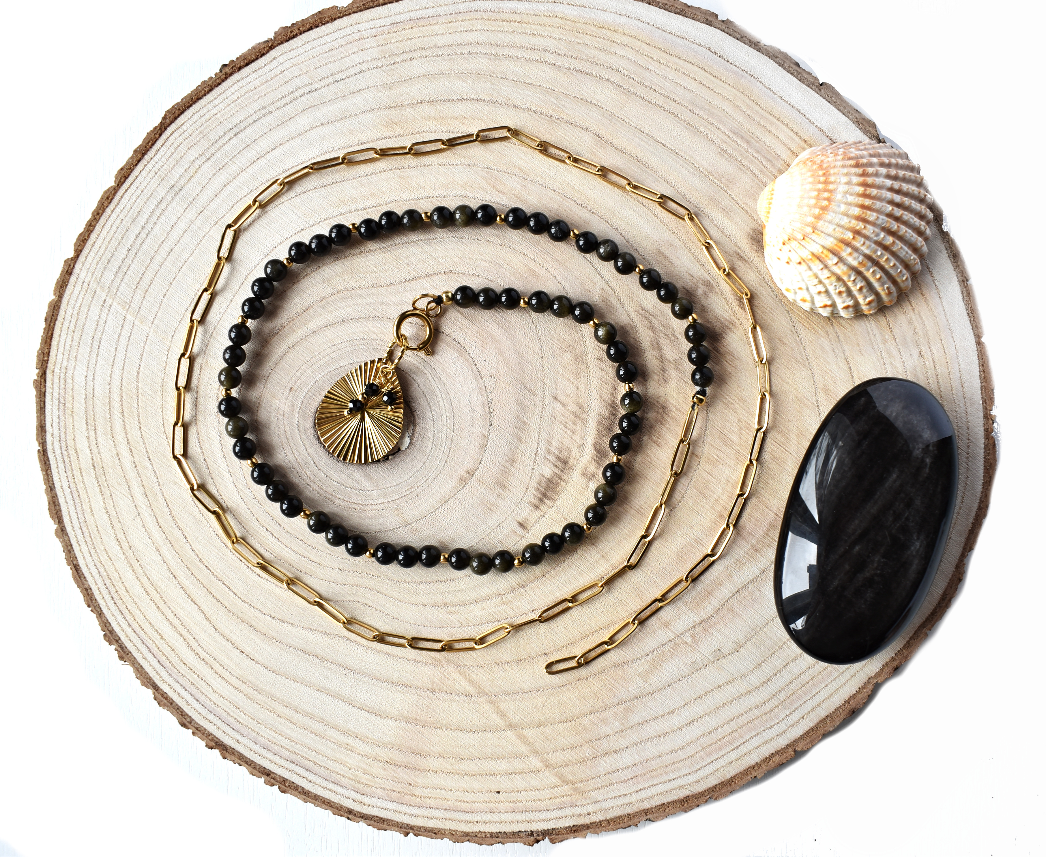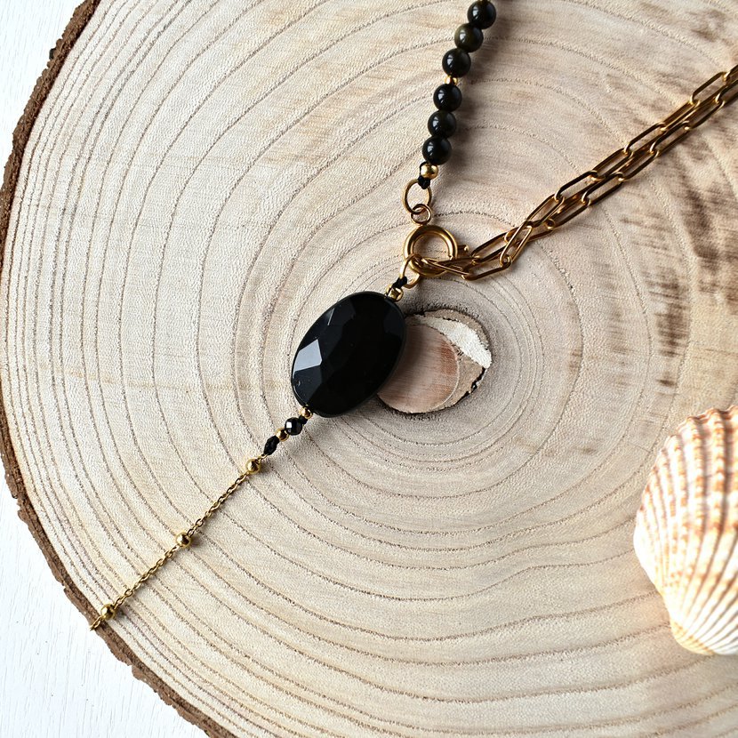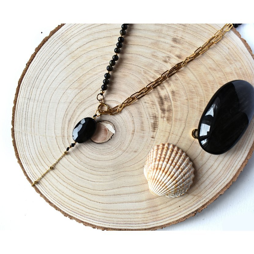 Obsidián ve své dokonalé eleganci a řetízek z pozlacené chirurgické oceli.