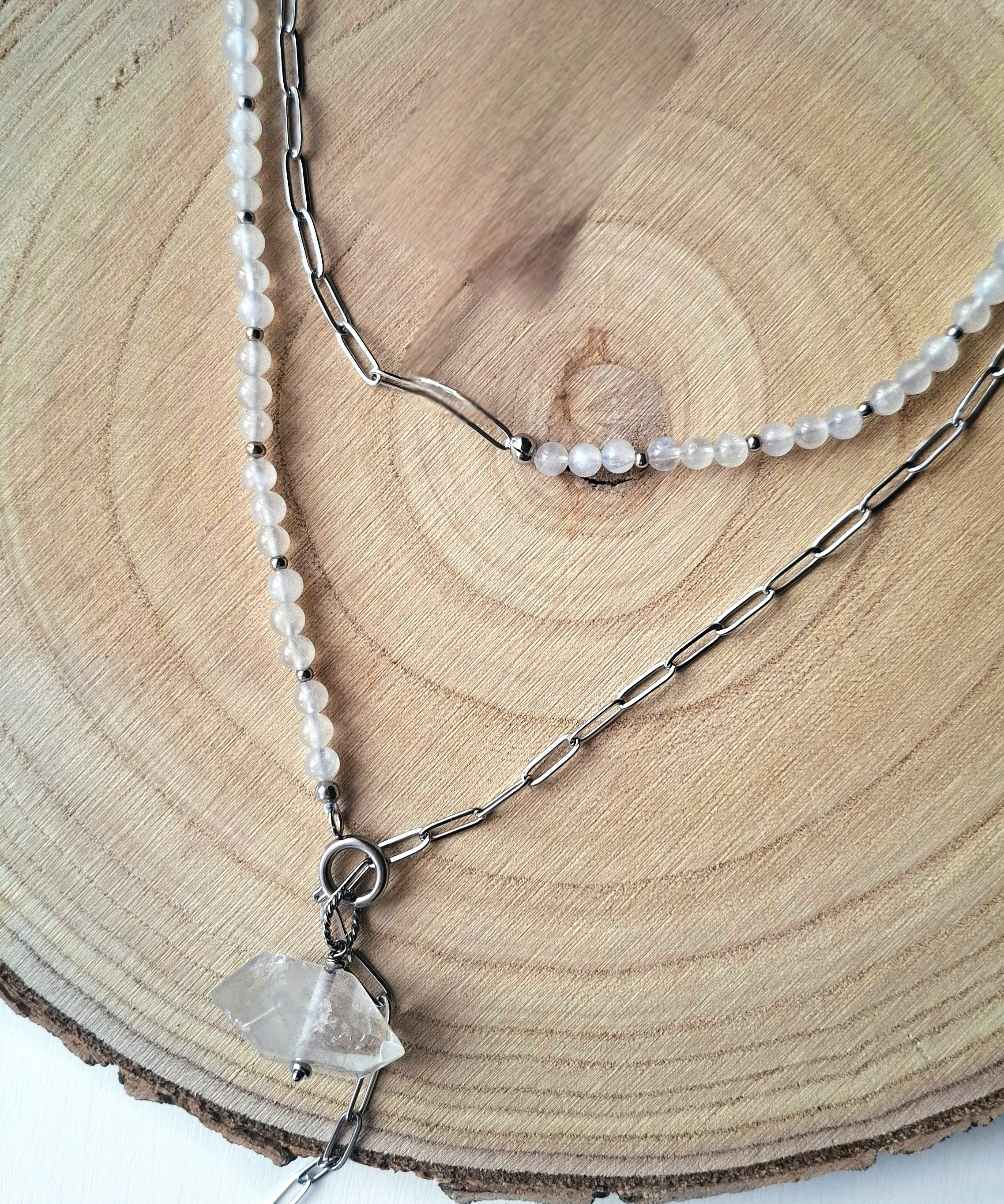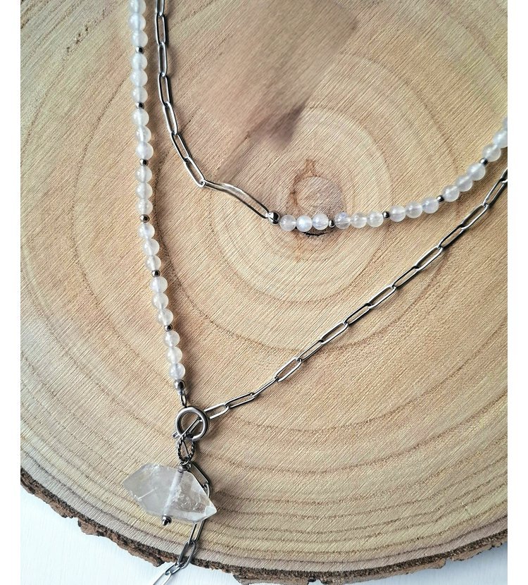 Oblečená/neoblečená; dáma/rebelka - náhrdelník tvořený 2 částmi. Korálky z jemného měsíčního kamene a ocelový řetízek z druhé strany.