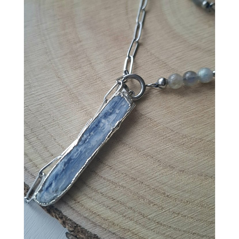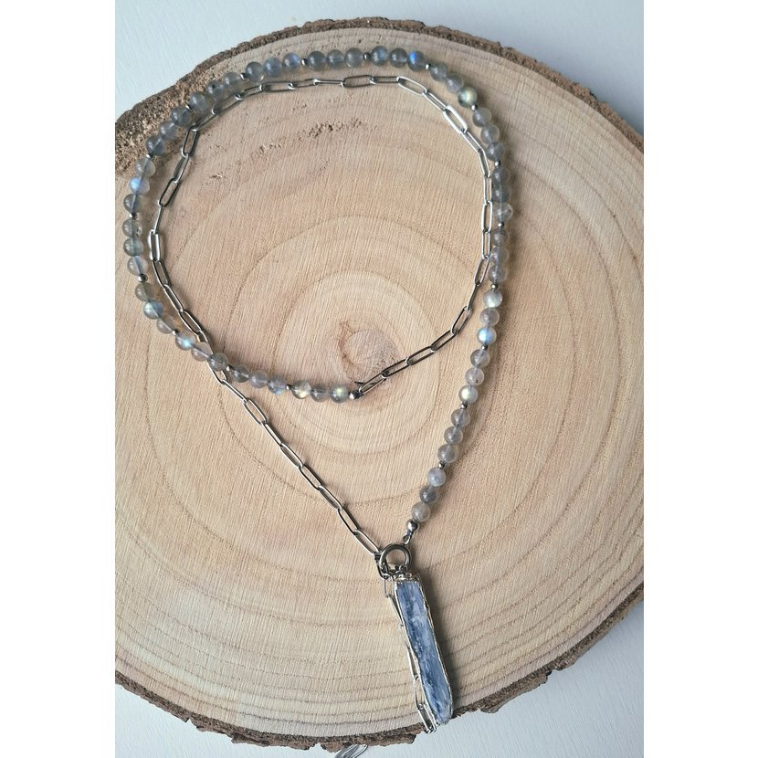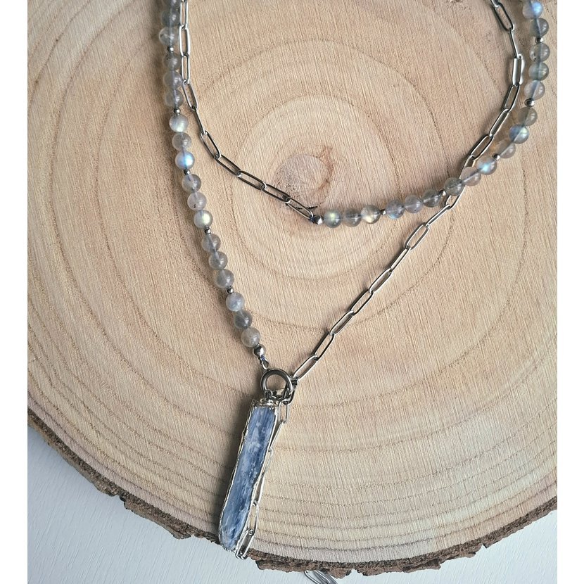 Oblečená/neoblečená; dáma/rebelka - náhrdelník tvořený 2 částmi. Korálky z jemného měsíčního kamene a ocelový řetízek z druhé strany.