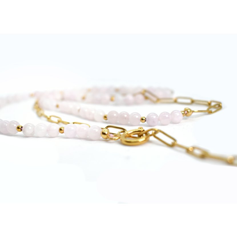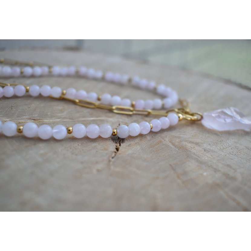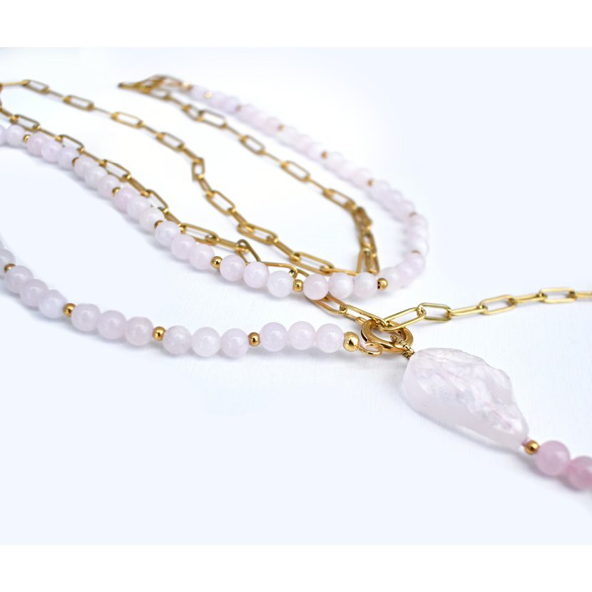 Oblečená/neoblečená; dáma/rebelka - náhrdelník tvořený 2 částmi. Korálky z růženínu a pozlacený řetízek z druhé strany.