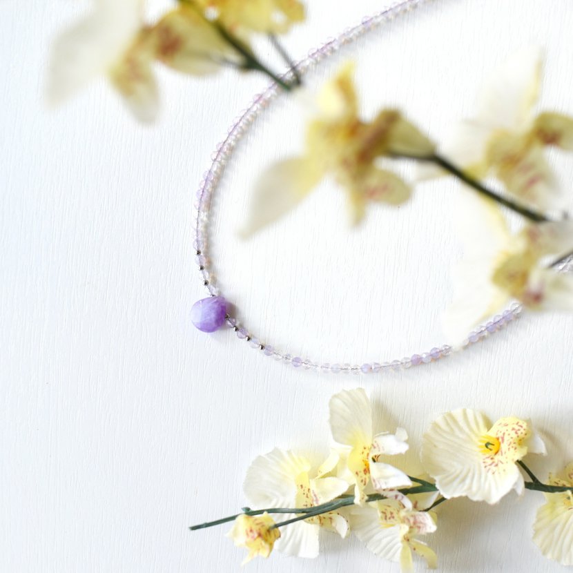 Náhrdelník z jemných fasetovaných korálků doplněný broušenou kapkou - vše ametyst