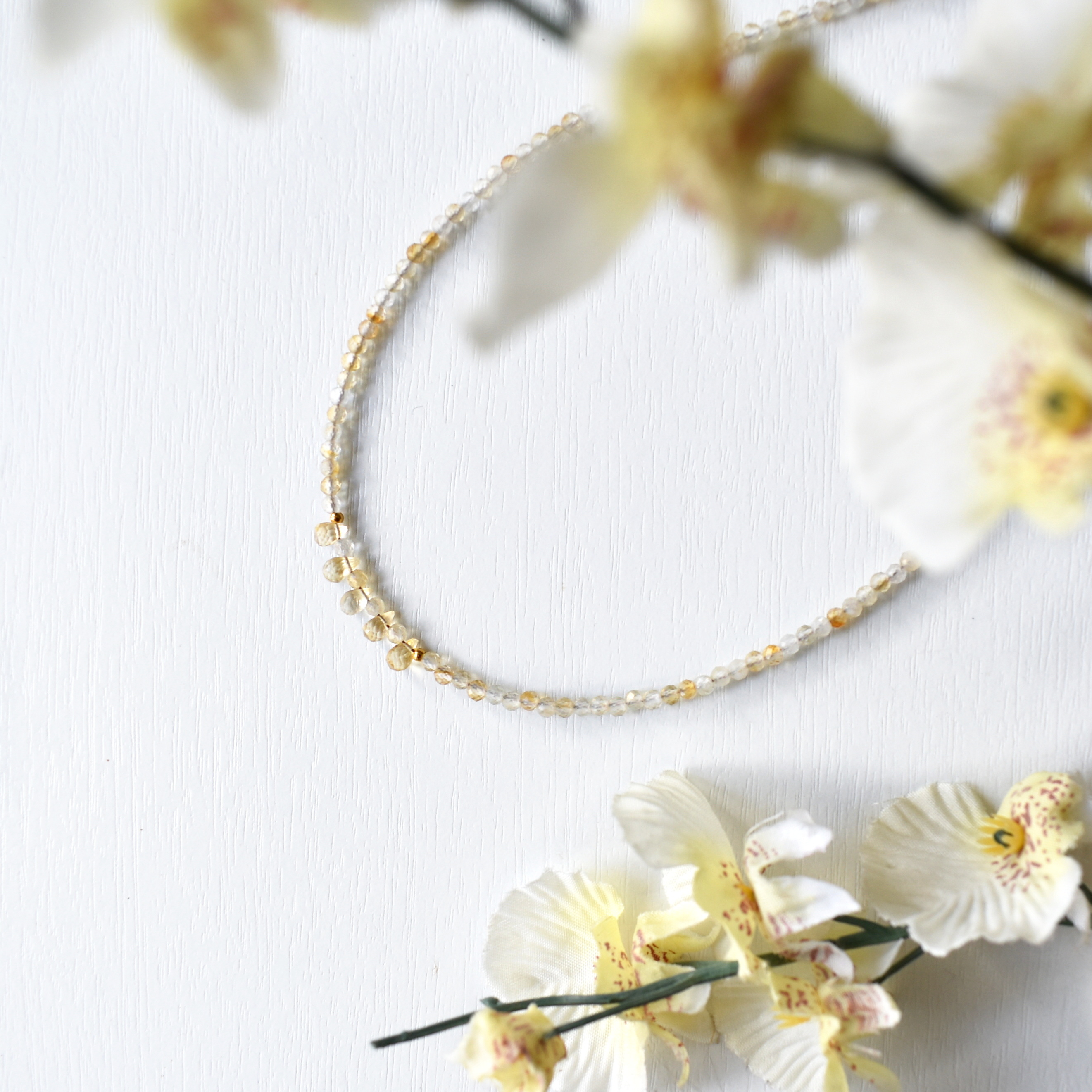 Náhrdelník z jemných fasetovaných korálků doplněný broušenými kapkami - vše citrín