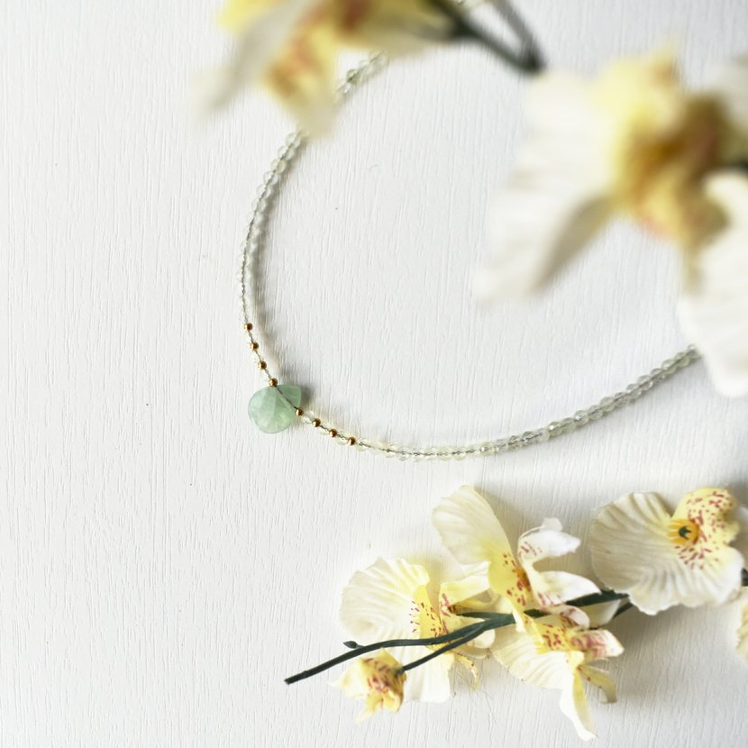 Náhrdelník z jemných fasetovaných korálků doplněný broušenou kapkou - vše fluorit