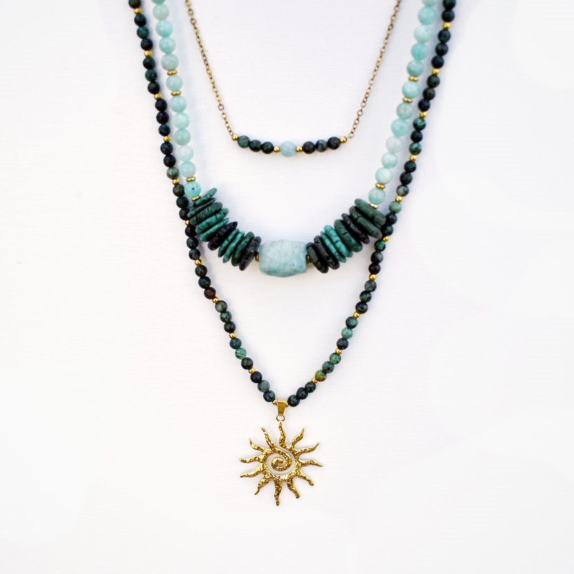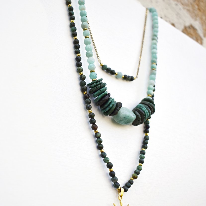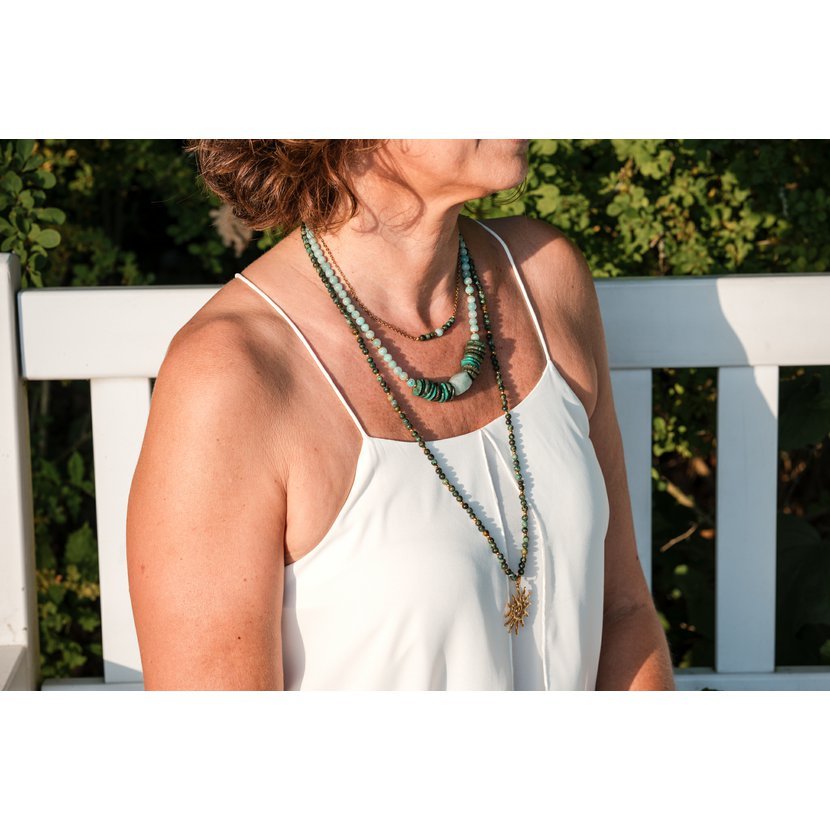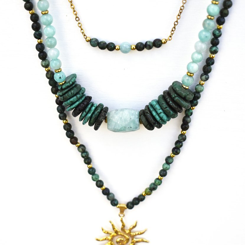 Náhrdelník je vyroben z kombinace kamenů tyrkenitu, apatitu, říčních perel, jaspisu a nerezových komponentů