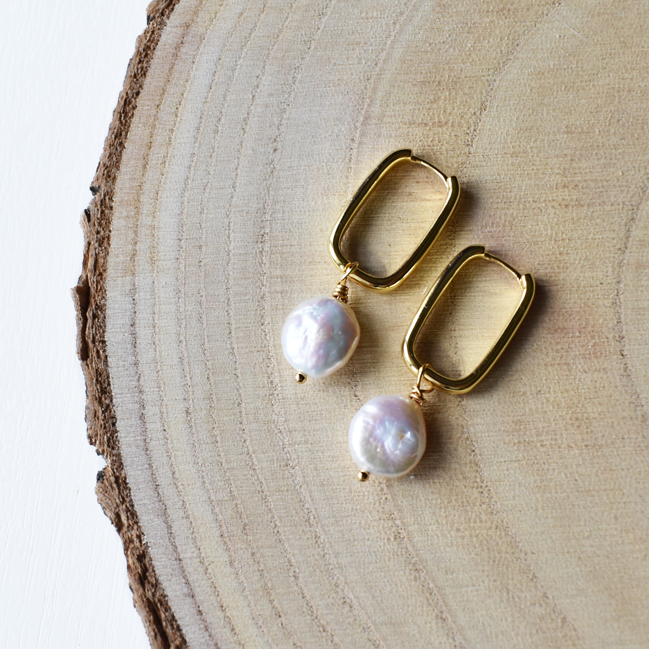 Náušnicové kroužky se zavěšenou říční perlou.