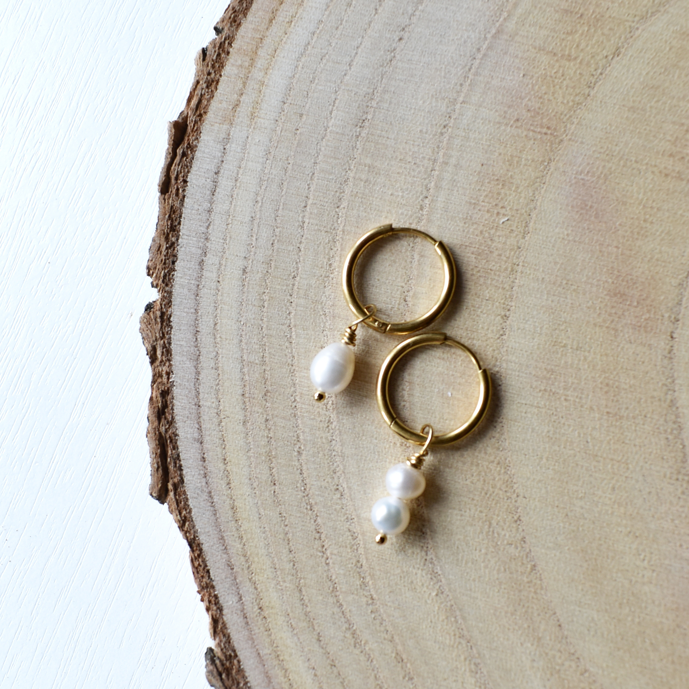 Náušnicové kroužky se zavěšenou říční perlou.