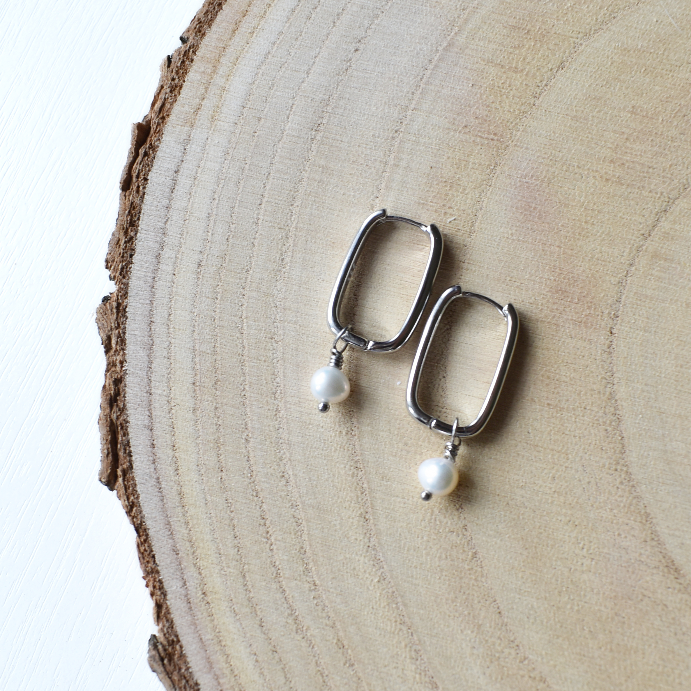 Náušnicové kroužky se zavěšenou říční perlou.