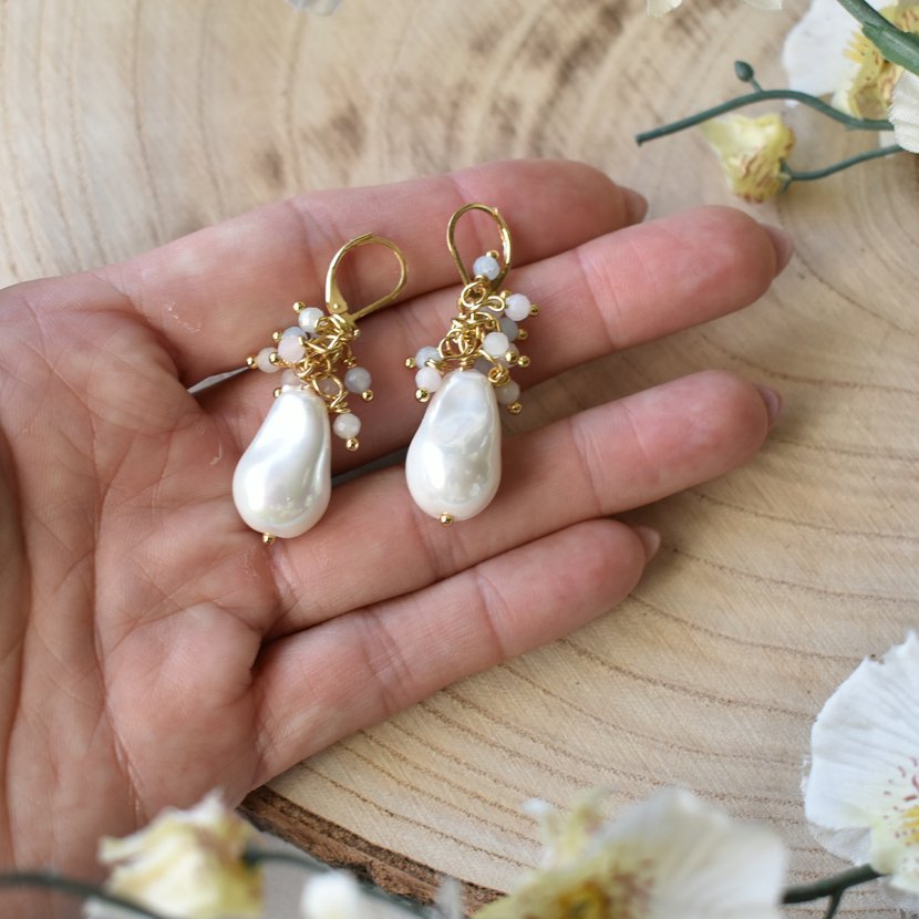 Luxusní náušnice z barokních perel, doplněny o hrozny drobných morganitových korálků