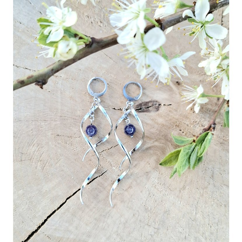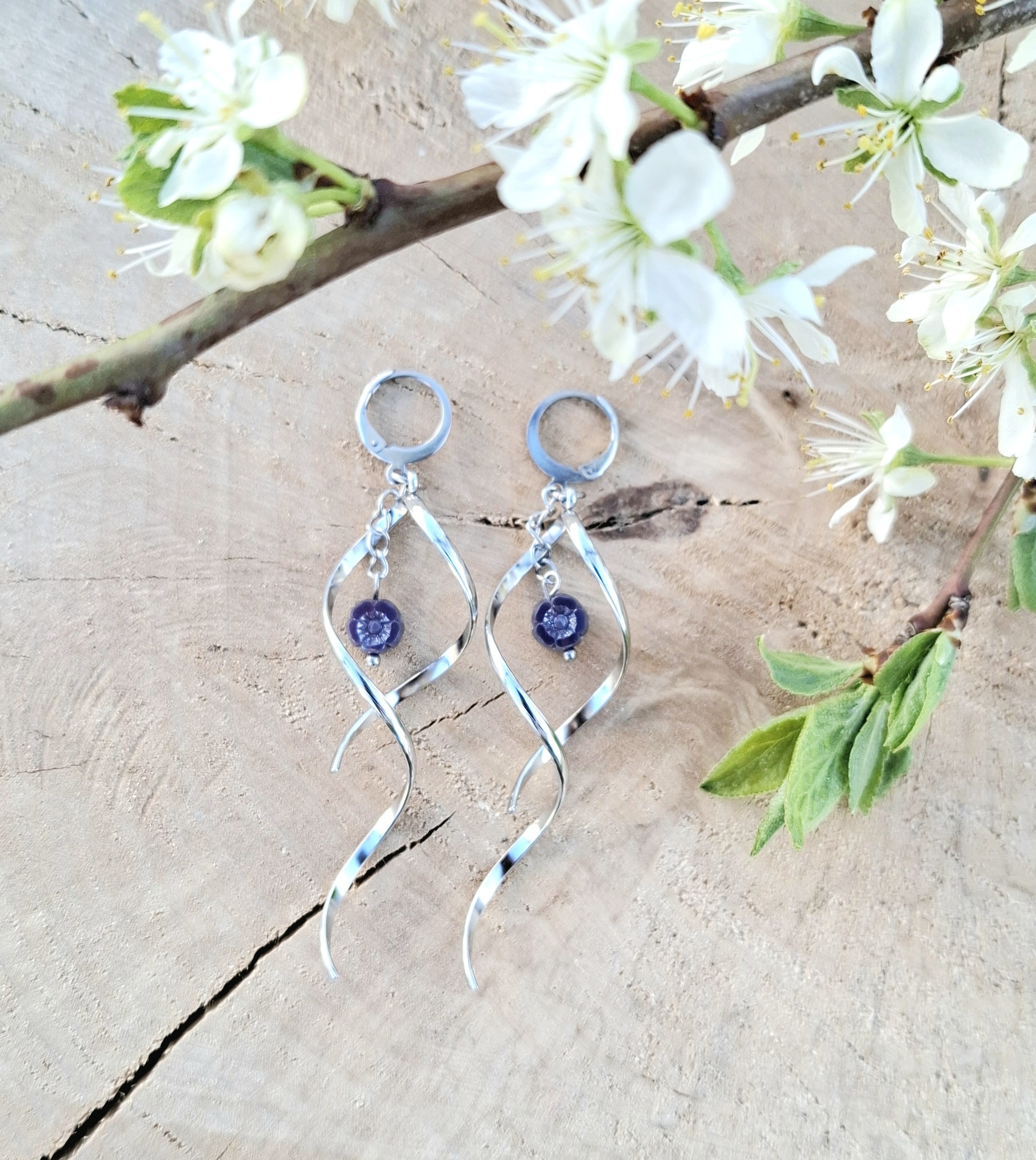 Spirály z nerez oceli, doplněné zavěšeným kvítkem z českého skla.