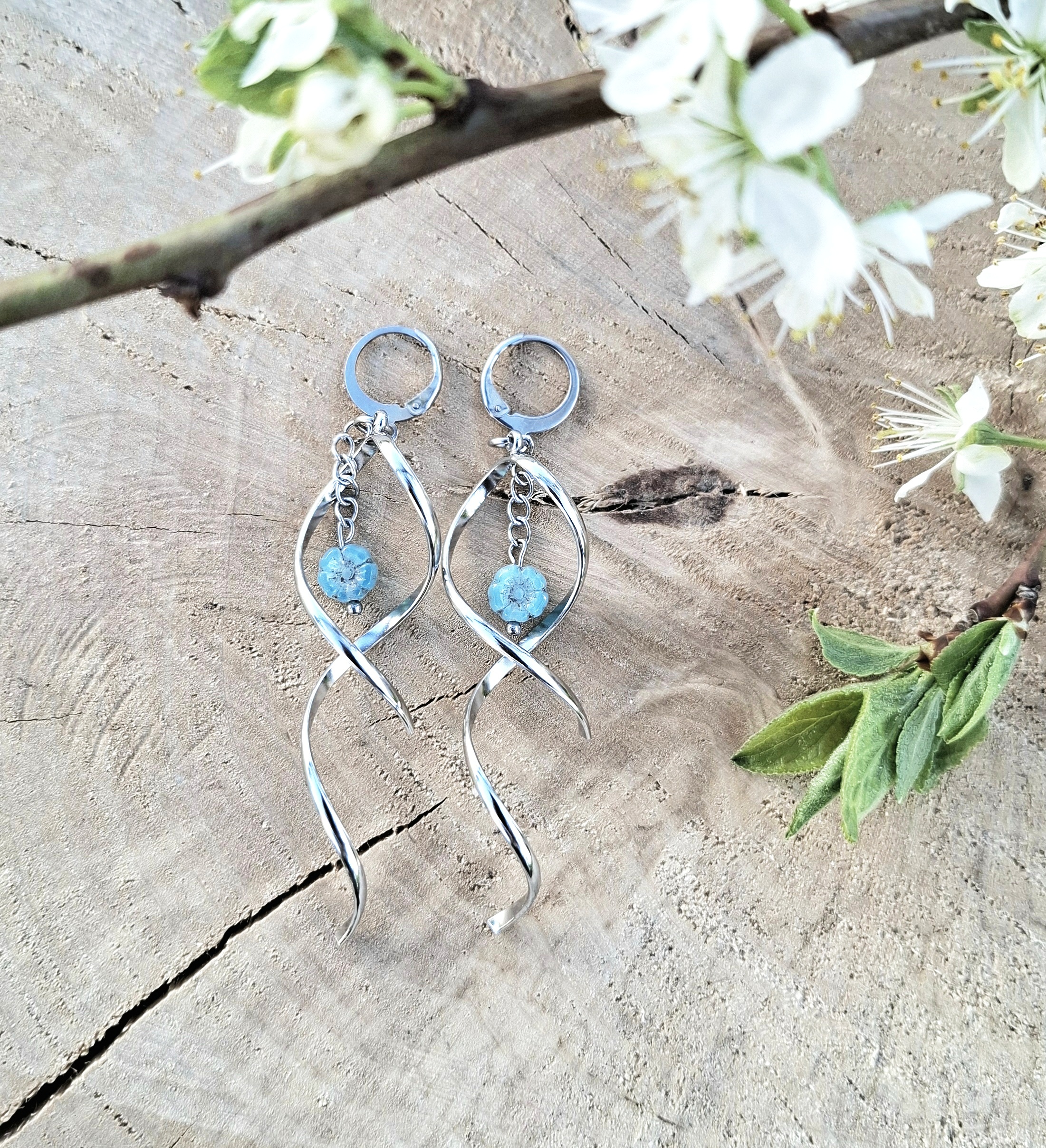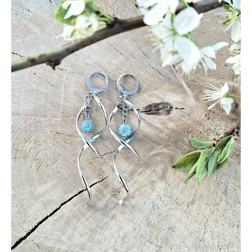 Spirály z nerez oceli, doplněné zavěšeným kvítkem z českého skla.