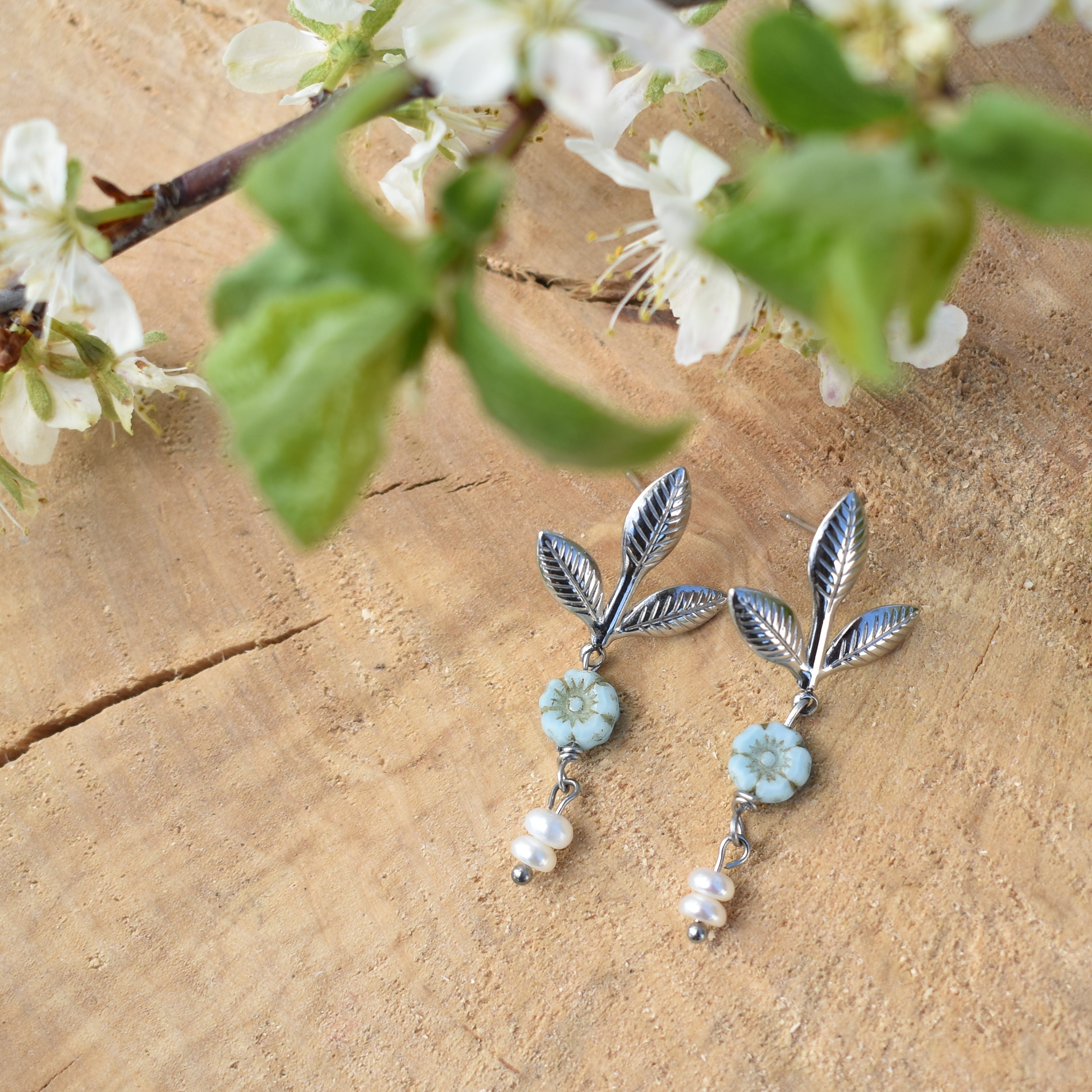 Lístky z nerez oceli, doplněné zavěšeným kvítkem z českého skla.