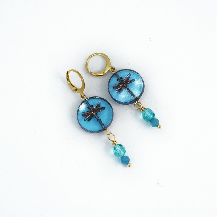 Boho náušnice - nádherné vážky z českého skla, doplněné o několik drobných minerálních korálků.