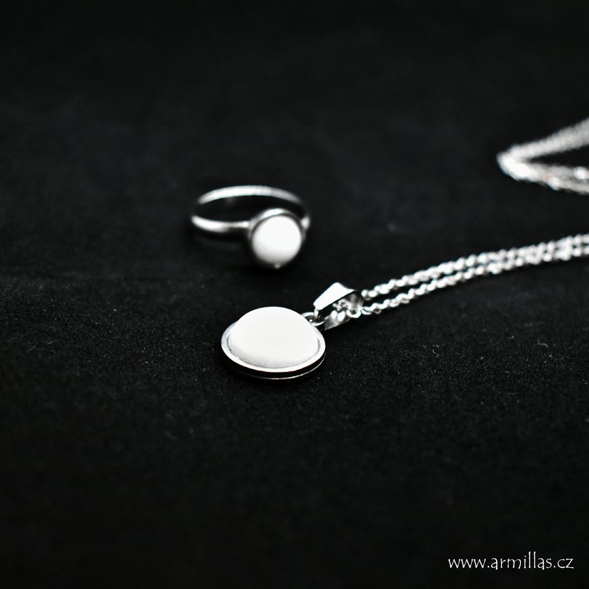 Řetízek z chirurgické oceli s přívěskem s vloženým kabošonem bílého jadeitu. Kámen velikosti 12 mm.