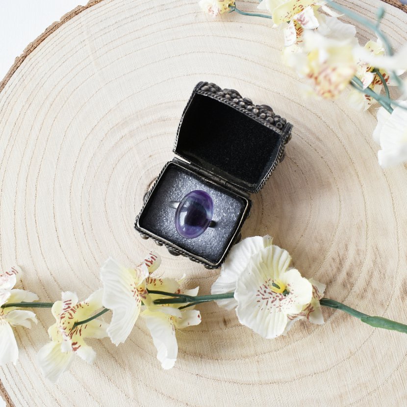 Nádherný fialový fluorit. Kámen o velikosti 13/18 mm na ocelovém prstýnku