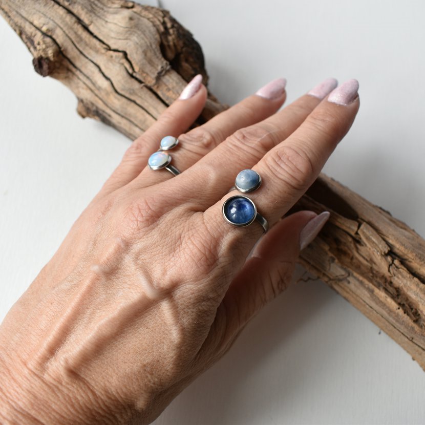 Modrý kyanit. Ocelový prsten se 2 kameny.