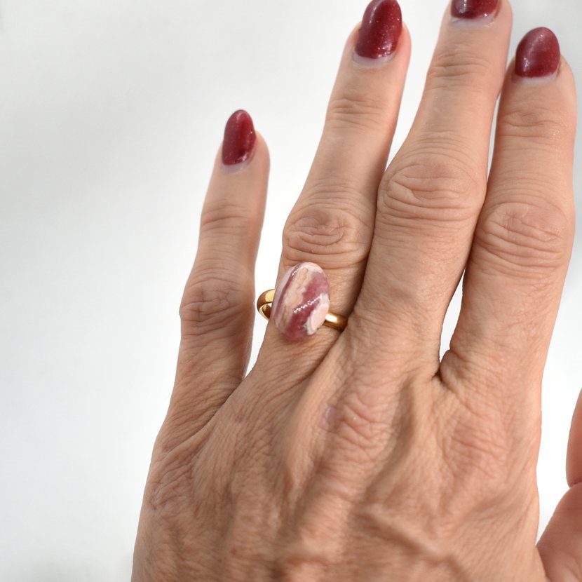 Rodochrozit. Kámen o velikosti 10/14 mm na ocelovém pozlaceném prstýnku