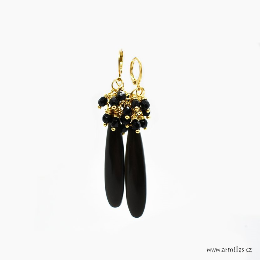 Luxusní Boho náušnice - kapky černého achátu a hrozny z českých ohňovek.