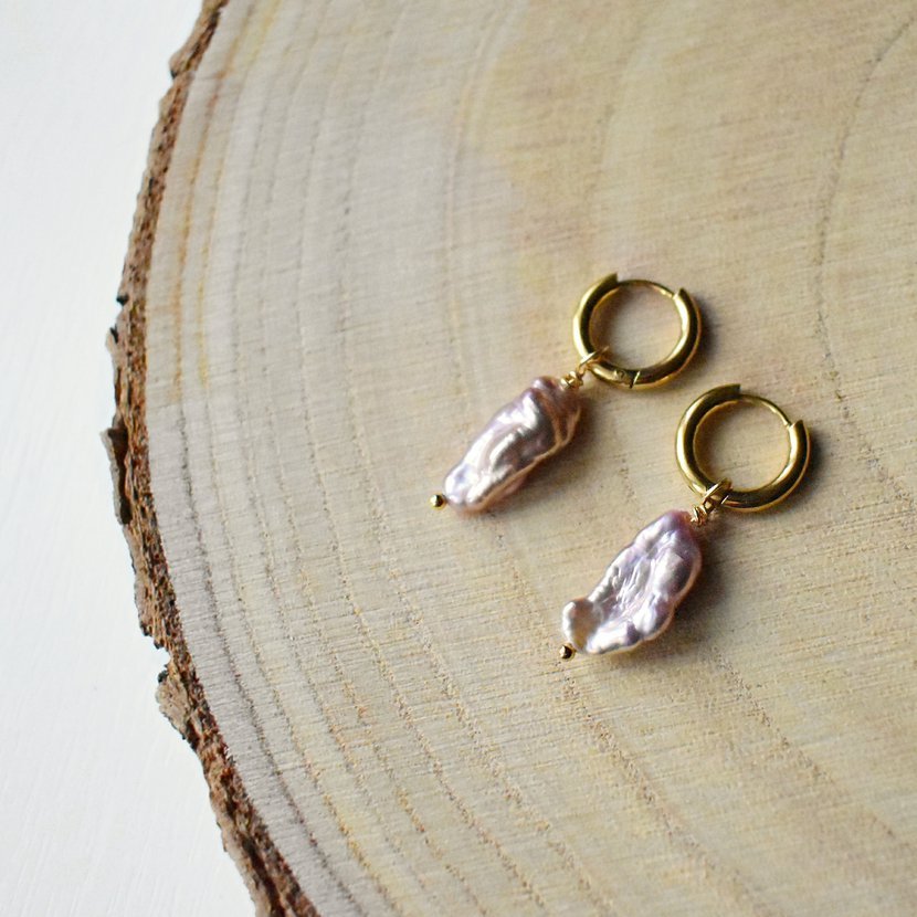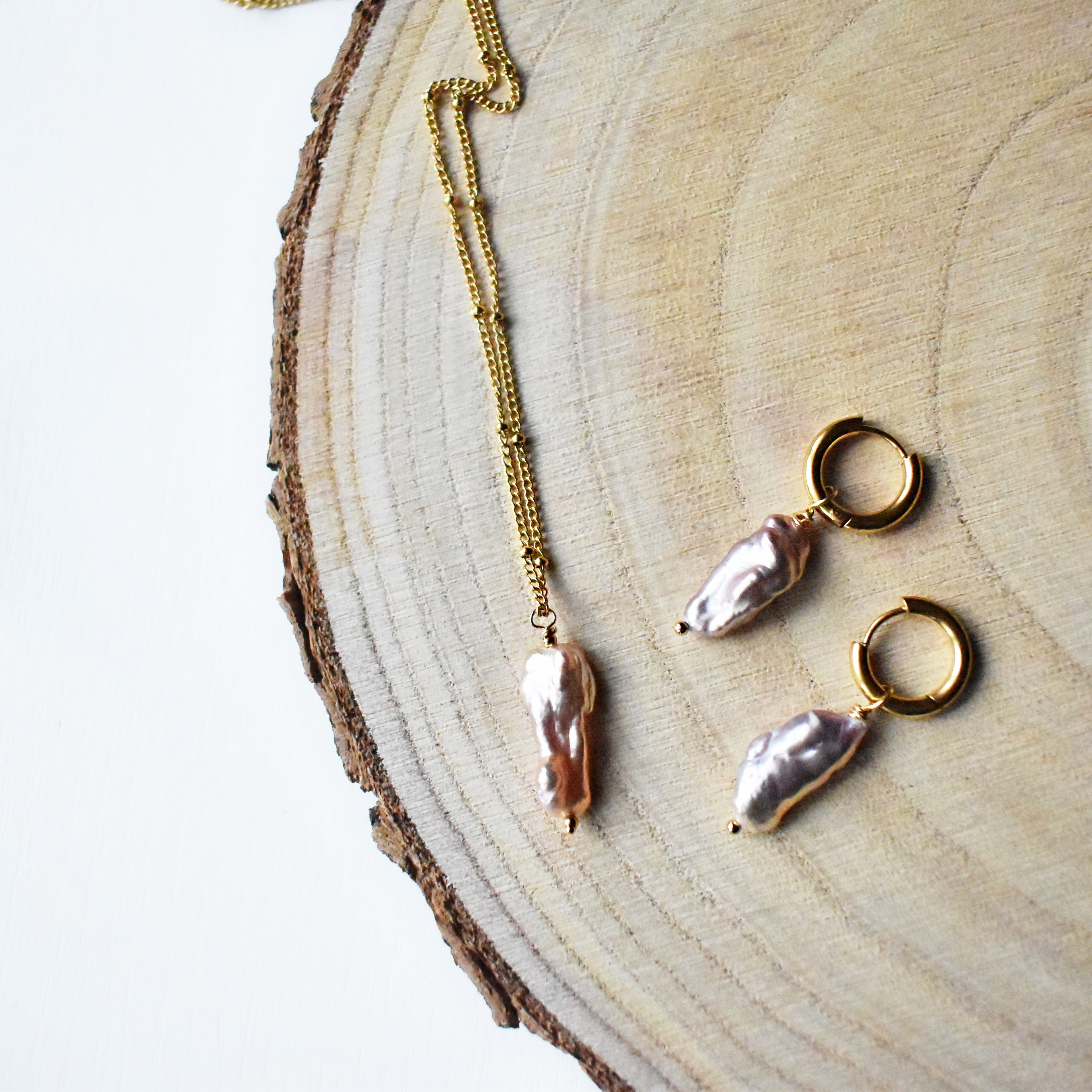 Náušnicové kroužky se zavěšenou barokní perlou v sadě s řetízkem se stejnou perlou.